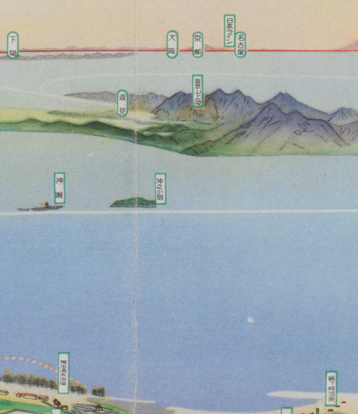 特徴的なのが、メインは緻密な地図絵なのだが、周辺部分に大胆な圧縮デフォルメ表現を加えているところで、北海道の地図だけど隅の方は東京大阪はおろか下関まで見渡すことができる。